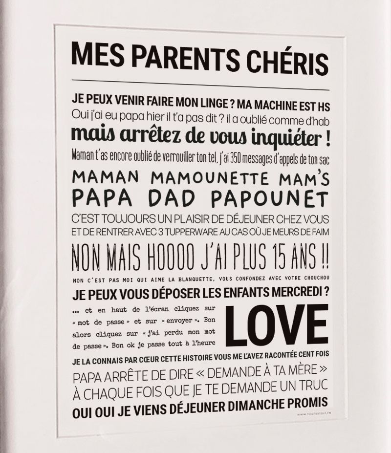 Le cadeau idéal à offrir à ses parents chéris. Parce qu’on ne sait JAMAIS quoi leur offrir. (un mix des affiches « Maman chérie » et « à toi mon papa »)