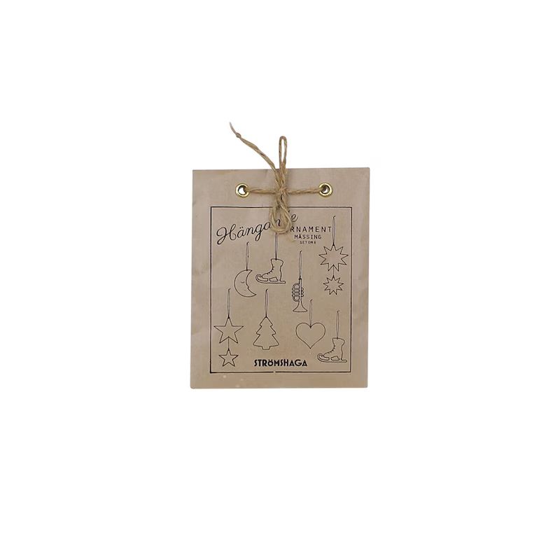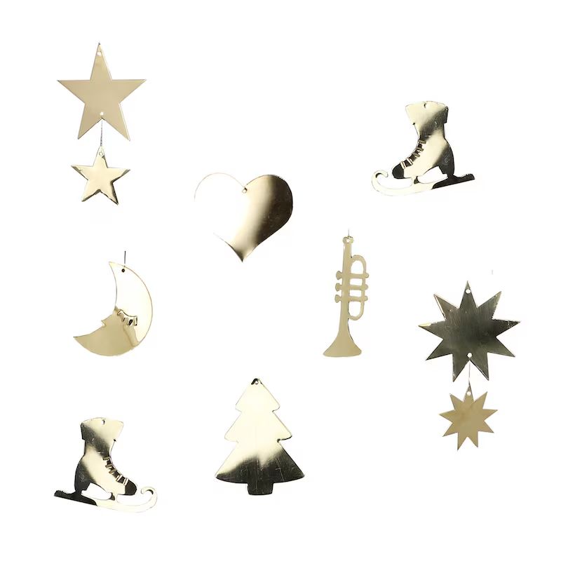 Décorations en laiton véritable avec des motifs de Noël classiques sous forme d’étoiles, de patins, d’un sapin de Noël, d’une trompette, d’une lune et d’un cœur. Accrochez-les dans le sapin de Noël et laissez les décorations refléter la lumière autour d’elles.