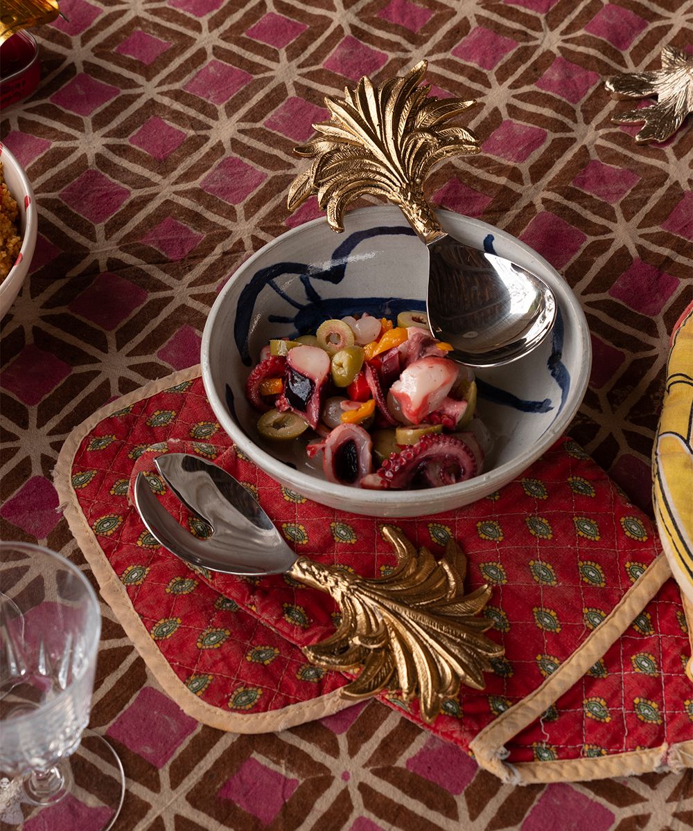 Vivez l’alliance parfaite de la fonctionnalité et du design avec les Couverts à Salade Palmier Marlin. Cette paire élégante, dotée d’un crochet pratique pour reposer sur votre saladier, apporte commodité et style à chaque repas. La fusion d’acier inoxydable durable et de laiton riche, façonnée à la main par nos artisans en Inde, ajoute une touche de luxe durable à votre collection de vaisselle.