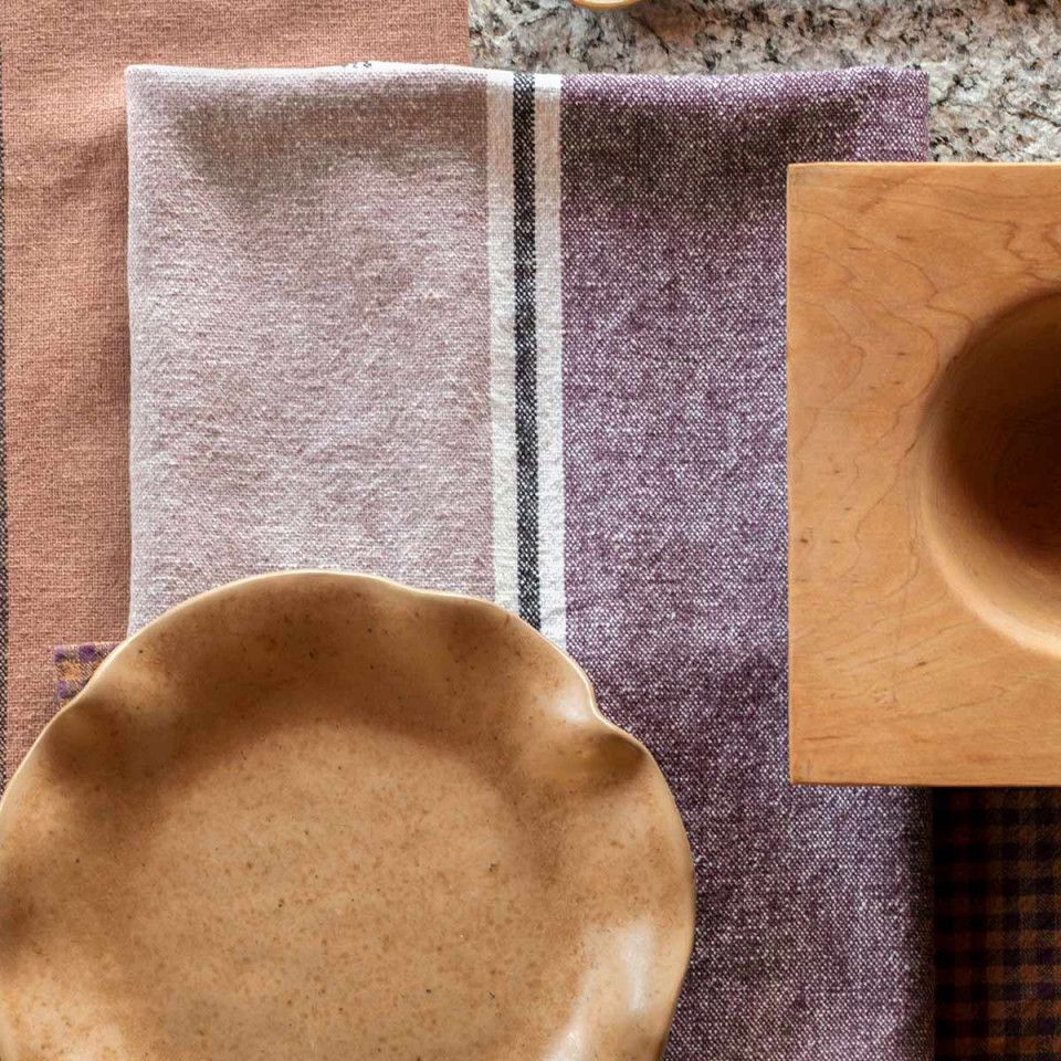 Torchon 100% lin, figue et rosé avec lignes blanches et noires